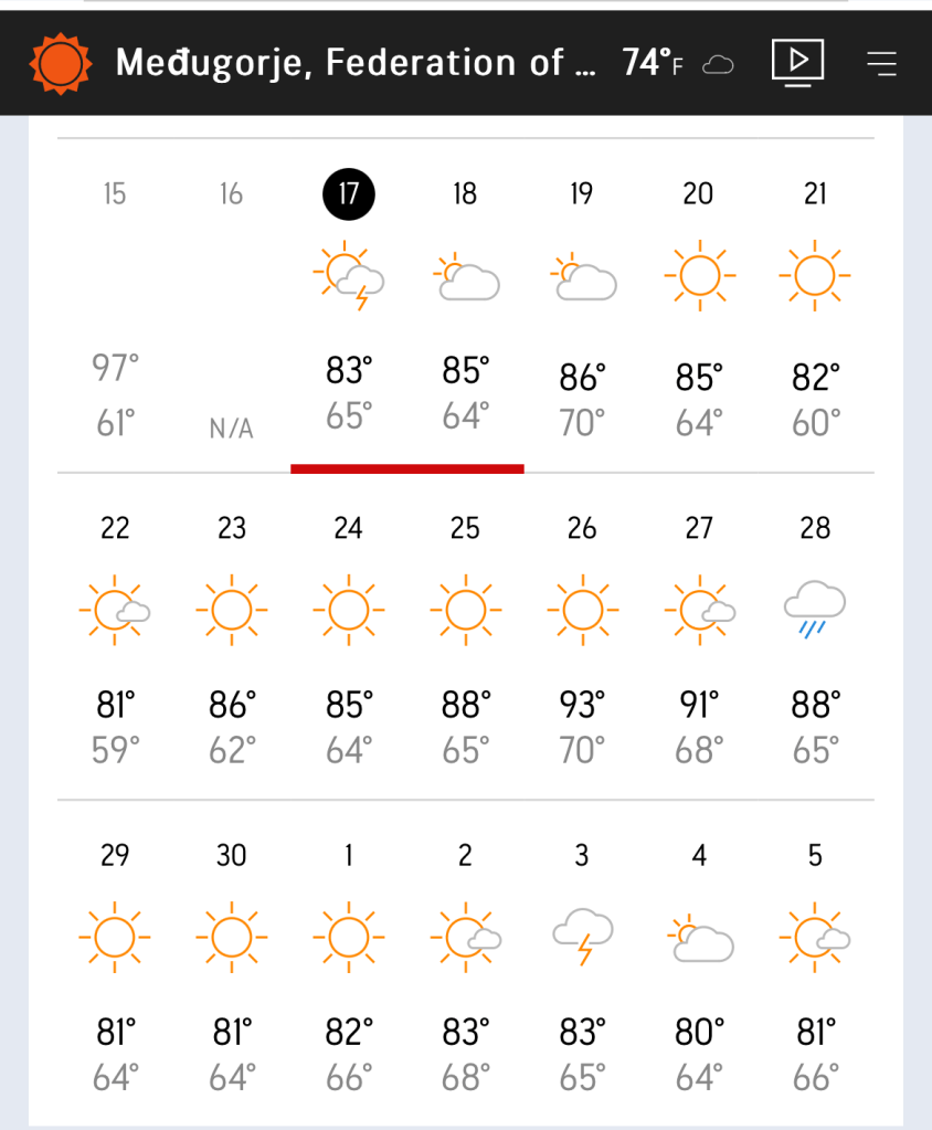 Our days in Medjugorje will be very warm, in the 80’s and 90’s, with plenty of sun. There is a chance of rain predicted, so it is good to be prepared. Umbrellas and rain ponchos are available for purchase in the village.